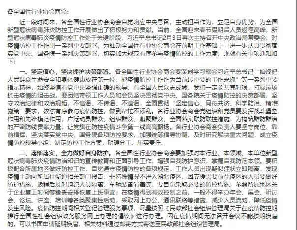 意見指出,各全國性行業協會商會要加強對本行業、本領域、本單位新型冠狀病毒肺炎疫情防治知識的宣傳教育和正面引導工作,增強自我防護意識,掌握自我防范本領。在疫情得到有效控制之前,一般不得舉辦年會、展會、研討會、論壇、講座、培訓等各類聚集性活動,采取網上辦公、通訊聯絡等措施,減少人員流動,降低疫情發生風險。疫情防控期間相關登記管理服務事項,盡量按照《民政部社會組織管理局關于在疫情防控期推行全國性社會組織政務服務網上辦理的倡議》進行辦理。因在疫情期間無法召開會議不能按期換屆的,可以書面申請延期換屆。