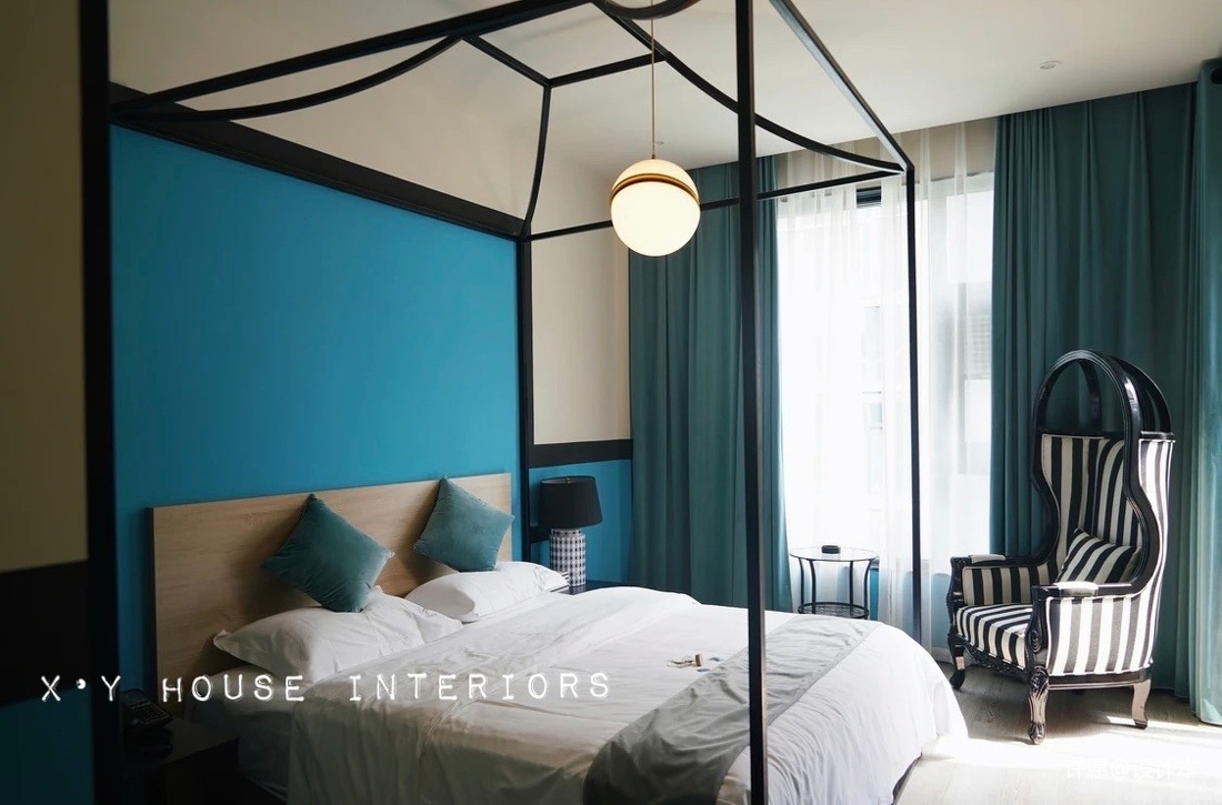 另有部分客房以‘時尚’為主題,時尚而精致,房間通過局部墻面色、窗簾、家具等軟裝的色彩搭配來營造不同時尚感的客房。民宿三層原始建筑5.6米的層高為客房的打造提供了一個契機,極大地豐富了豎向上的空間體驗。下圖是親子房,同樣是5.6米挑高房型,面積更大一些,局部分隔成了兩層,上次休息睡覺、下層休閑娛樂,并在房間里設計了不同造型的木質滑滑梯。